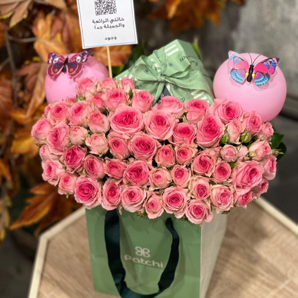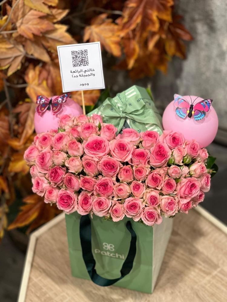 شوكولاتة باتشي منسقة داخل كيس باتشي بورد بيبي روز وردي مع بالونات وفراشة بلون وردي تدمج نكهة شوكولاتة بستاني الفاخرة مع تنسيق زهور مبهج، ما يجعلها هدية متكاملة للمناسبات. تُحضَّر الشوكولاتة طازجة وتُغلَّف بعناية للحفاظ على النكهة والشكل أثناء التوصيل.